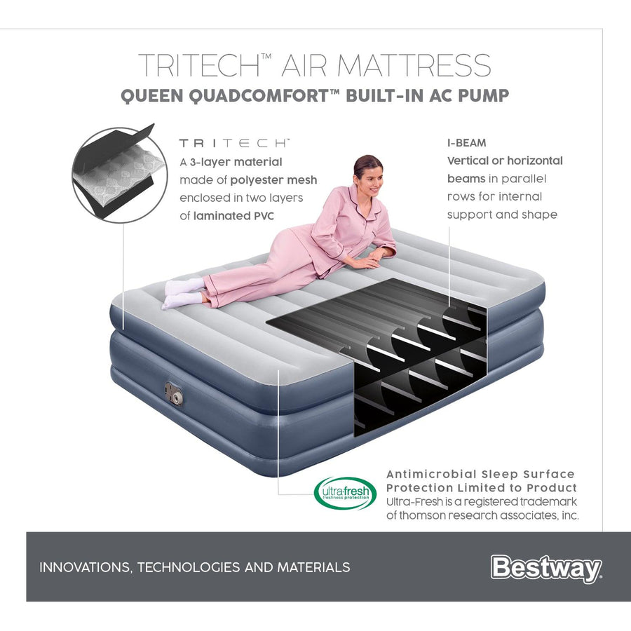 Los colchones de aire para interiores Tritech™ de Bestway® ofrecen a los consumidores materiales, estructuras y características de alta calidad para una calidad de sueño constante. Estos colchones de aire son ideales para habitaciones de invitados, salas de juegos o cuando hay invitados de visita. Con material Tritech, estos colchones ofrecen comodidad y confiabilidad. Al construir la estructura interna con un núcleo de malla de poliéster revestido con dos capas de PVC laminado, proporciona resistencia al estiramiento con el tiempo y minimiza la pérdida de aire con cada uso.
